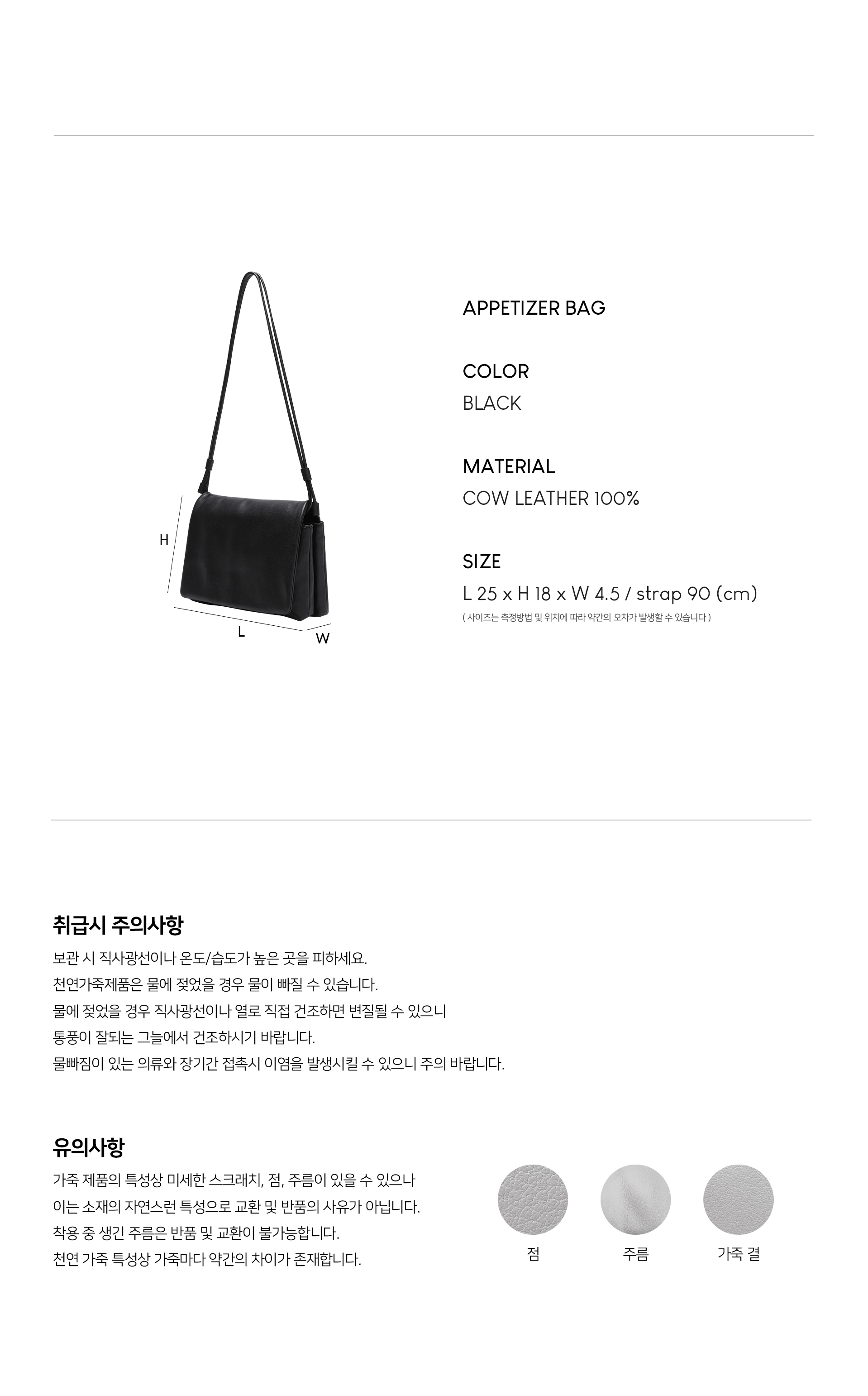 테너리와 직접 소통하여 자체 선별한 천연 카우하이드 베이스로 내구성이 강합니다. 하드한 소재가 아닌 MILLING 작업과 파운드 공법을 거친 고가의 레더로 양가죽처럼 부드럽습니다. 시중 레더 BAG 과는 다른 가벼움으로 디자인 합니다. |