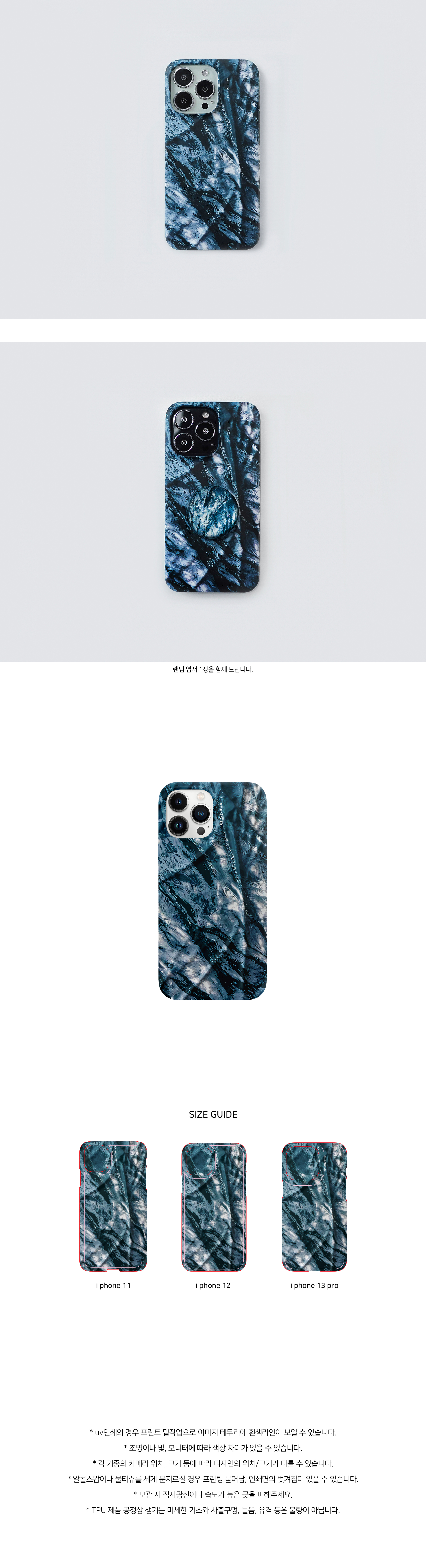 케이스는 1:1 제작 상품으로 교환, 반품이 불가합니다.아이폰을 제외한 기종은 카카오톡 문의 후 주문 부탁드립니다.카메라 높이가 낮을경우 (iphone 7/8 등) 디자이너 코드가 가로로 인쇄됩니다.